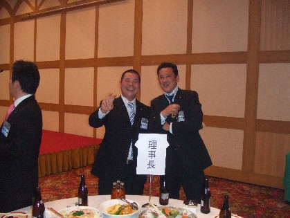 【懇親会での小笠原副会長と塩尻JC・今井理事長の2ショット。「理事長」という席次が燦然と輝く中、小笠原副会長もいずれはこの席に・・・・・・♪】